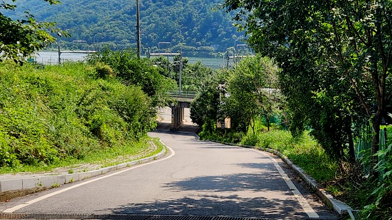 도로를 건너서 철교 지하통로를 통과하며 양수역뒷길 삼거리에서 양서탁구장
